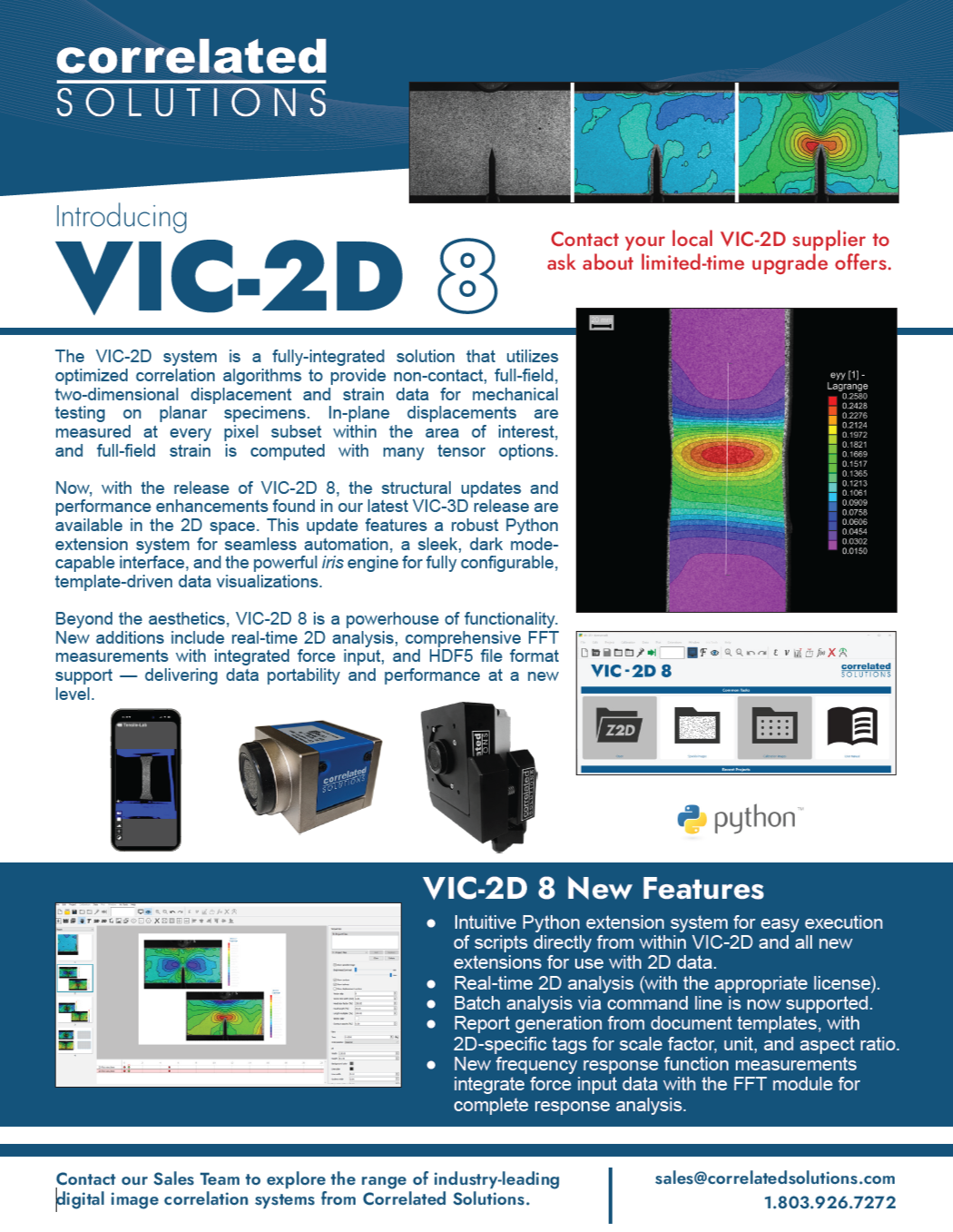 The wait is over: VIC-2D 8 is here. We’ve completely overhauled our 2D digital image correlation suite to include the structural updates and performance enhancements found in our latest VIC-3D release. This update is built for modern experimental mechanics, featuring a sleek, Dark Mode-capable interface, a robust Python extension system for seamless automation, and the powerful iris engine for fully configurable, template-driven data visualization.