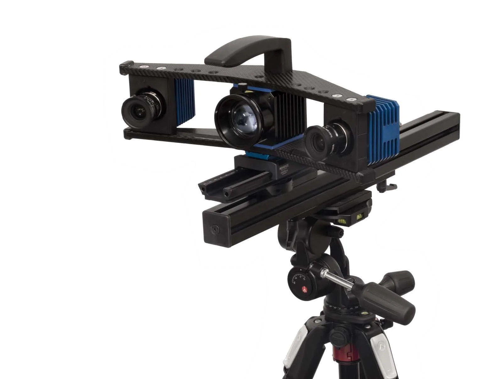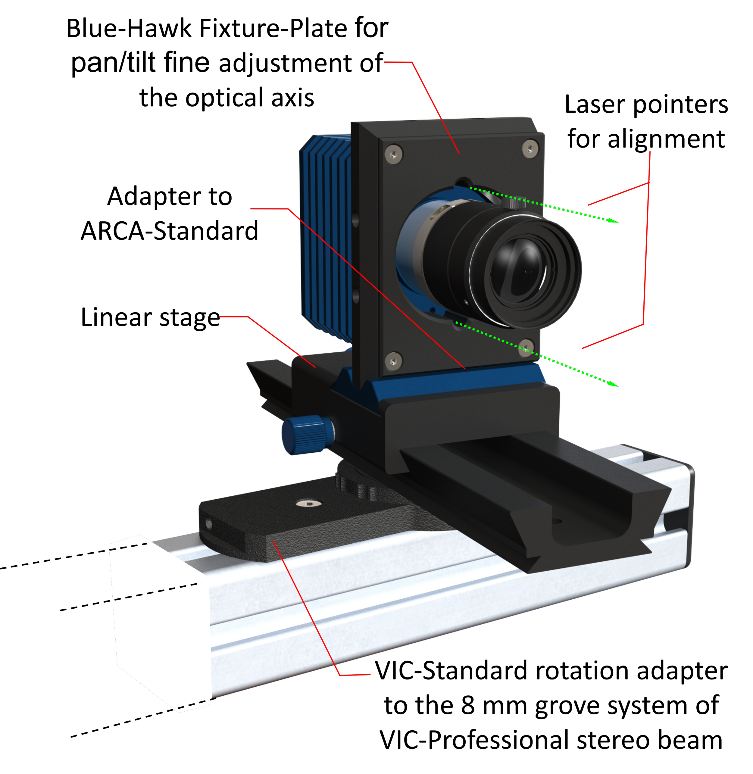 The Blue Hawk system can be mounted directly on a tensile tester via an adjustable arm, or it can be used on a tripod. Two internal laser pointers per camera assist with alignment to the specimen axis and indicate the required working distance. Alignment is performed using the tripod head or a levelling adapter. The working distance is preset using the horizontal beam, and focus is fine-tuned using a linear stage. What sets the Blue Hawk system apart is the shear range of setup possibilities.