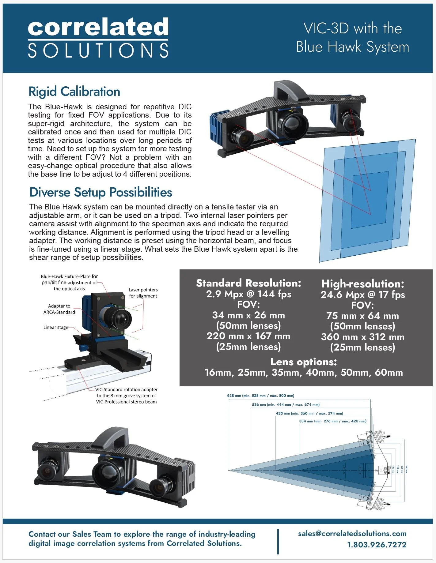Compared to the variety of fixed field-of-view (FOV) DIC options available, VIC-3D with the Blue Hawk system offers more adjustability without compromising convenience, so researchers can measure a wide variety of applications with minimal adjustment. Once the FOV preference is set (with easy lens/baseline adjustments to pre-determined fixed locations), the system can be used repeatedly with the same stereo calibration model. This combination of precision and repeatability produces highly accurate results with an unmatched level of convenience.