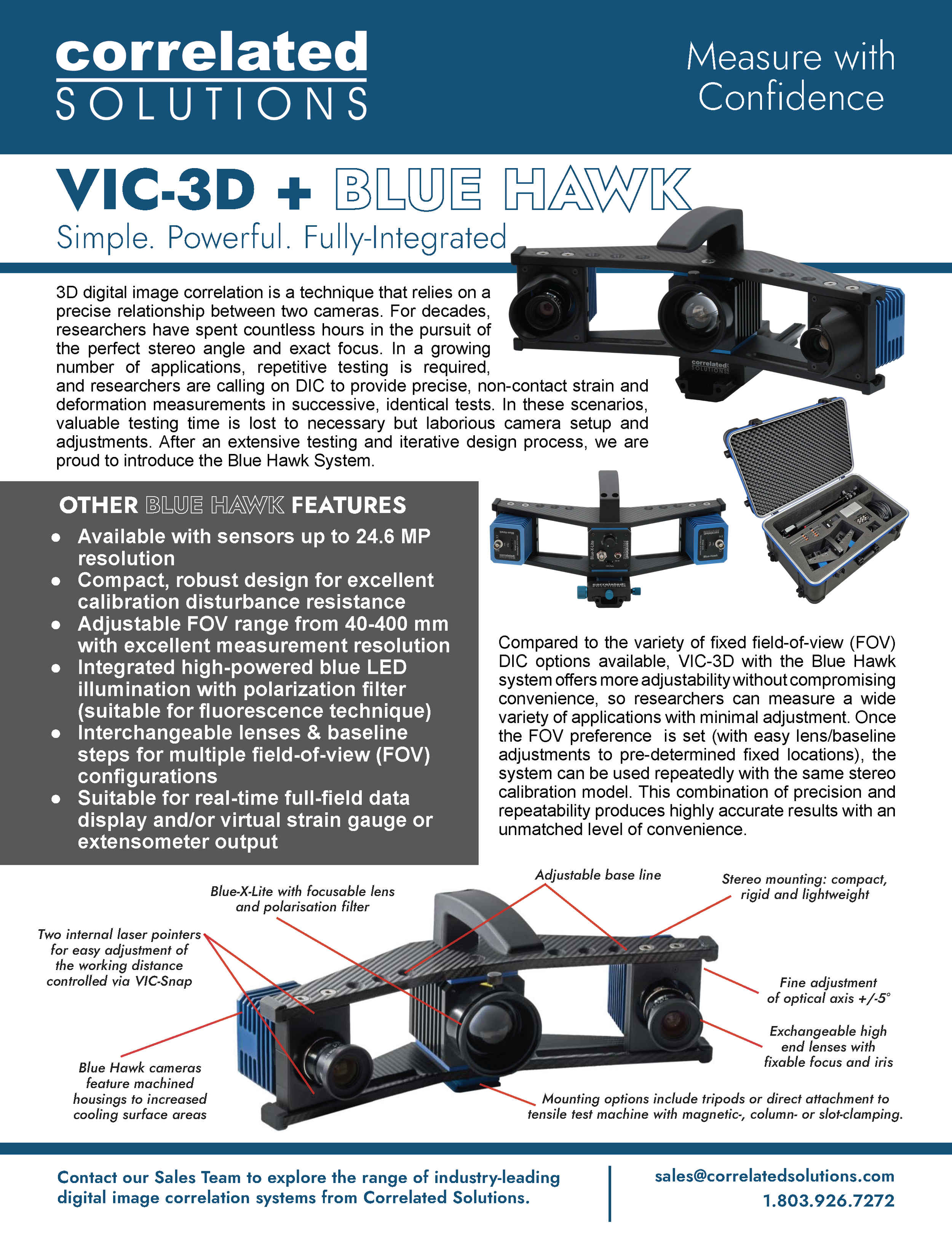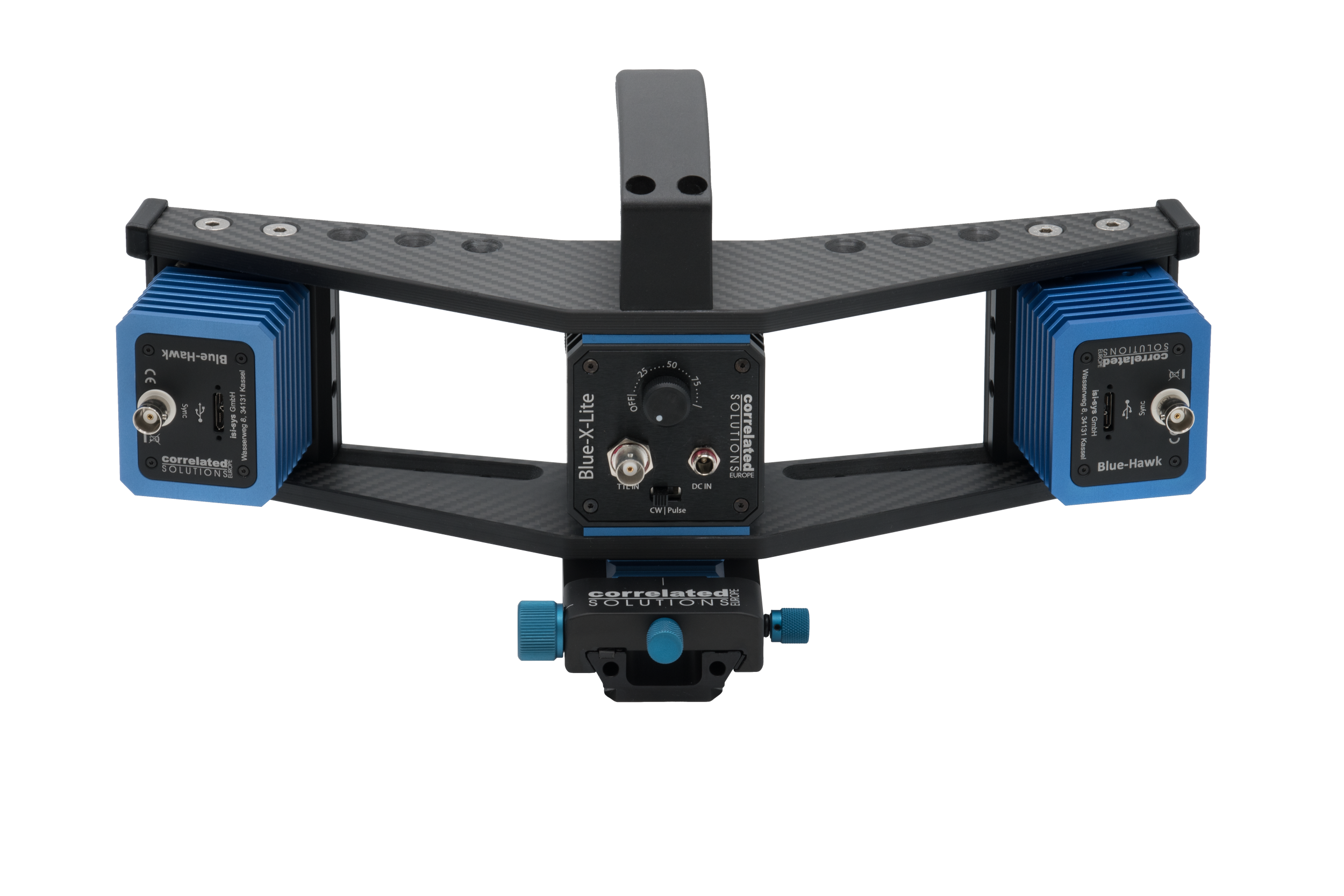 3D digital image correlation is a technique that relies on a precise relationship between two cameras. For decades, researchers have spent countless hours in the pursuit of the perfect stereo angle and exact focus. In a growing number of applications, repetitive testing is required, and researchers are calling on DIC to provide precise, non-contact strain and deformation measurements in successive, identical tests. In these scenarios, valuable testing time is lost to necessary but laborious camera setup and adjustments. After an extensive testing and iterative design process, we are proud to introduce the Blue Hawk system.
