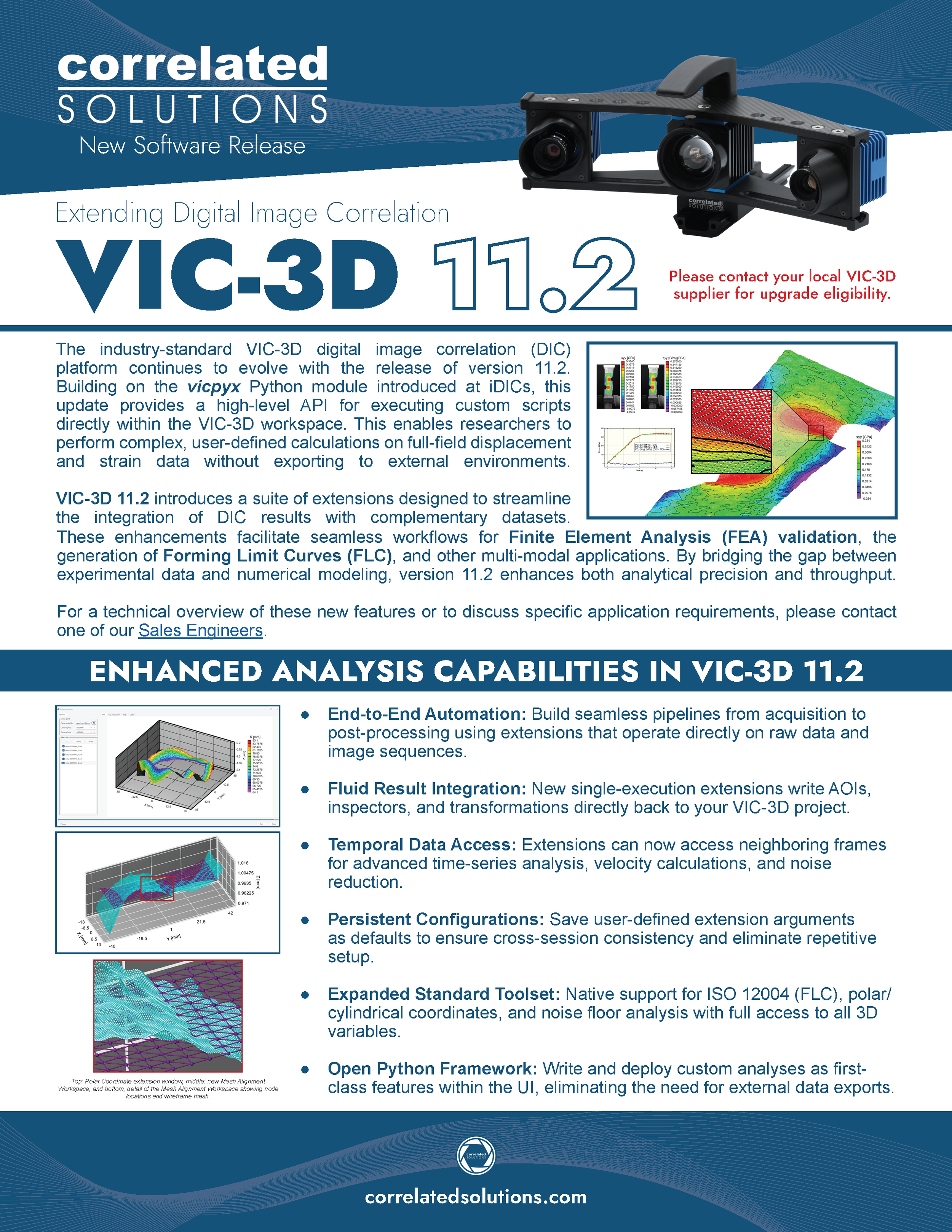 Python + DIC: Introduced in VIC-3D 11, the vicpyx update builds upon the previous VIC-Py framework deploying Python to manipulate, transform, and export DIC measurement data for application-specific requirements. Whether computing derived quantities, applying coordinate transformations, or combining multiple variables into new metrics, the vicpyx framework handles the complexity so researchers can focus on the engineering. Fully integrated with VIC-3D, vicpyx allows users to apply custom calculations to full-field data by executing Python scripts directly. This is an exciting and empowering way to achieve repeatable results and is especially useful for batch processing. Custom scripts may also be developed upon request, and sometimes at no cost (evaluated on a case-by-case basis).