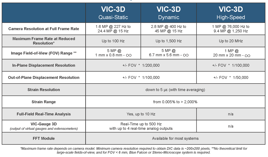 The VIC-3D system is a powerful turnkey solution for measuring and visualizing full-field, three-dimensional shape, displacement, and strain based on the principle of digital image correlation. Using this method, 3D displacements and strains can be obtained at every pixel on the specimen’s surface. All systems are customized and are available for a wide range of size scales for quasi-static and dynamic events. All systems are turnkey and include all necessary software, hardware, training, and technical support to ensure the system operates exactly as expected.